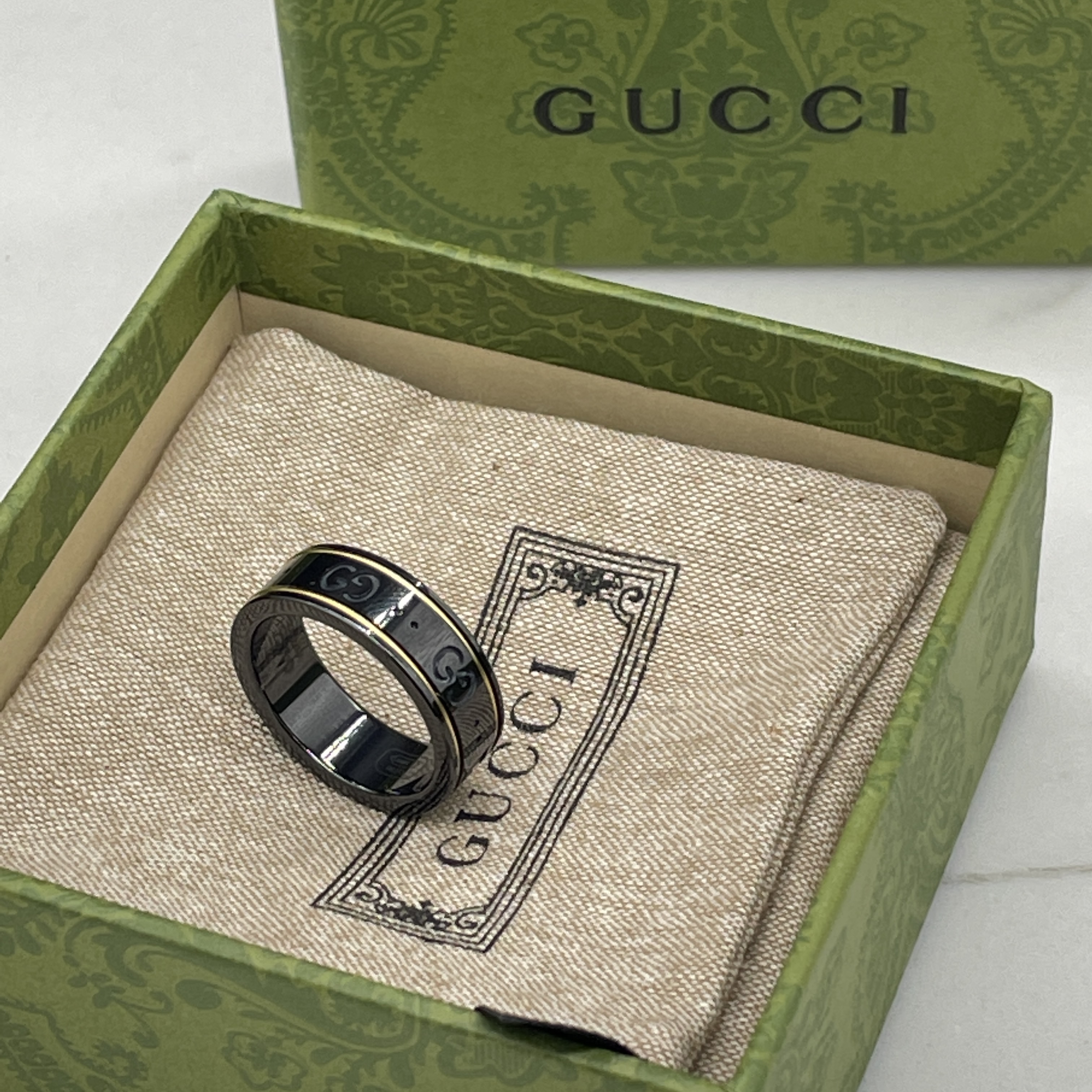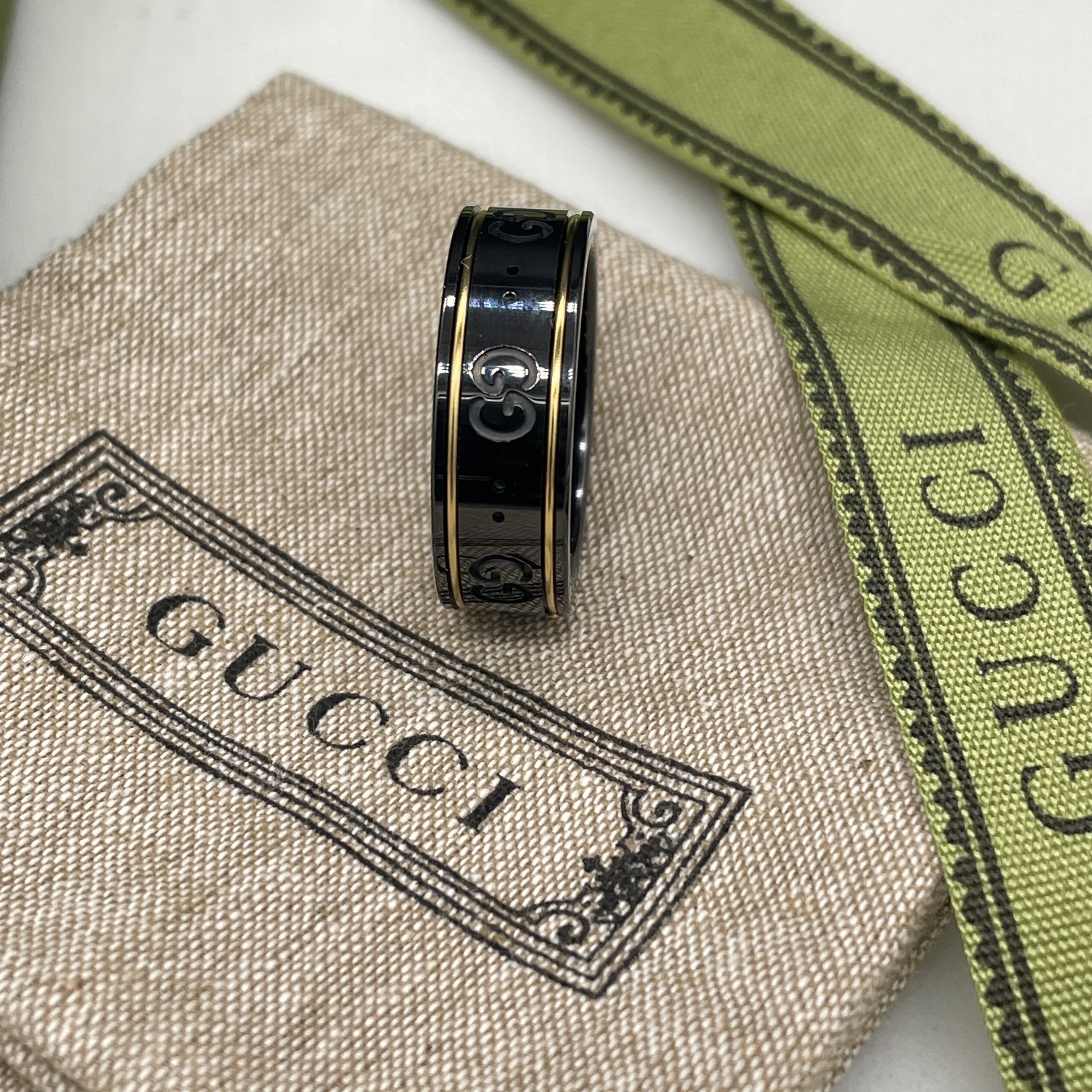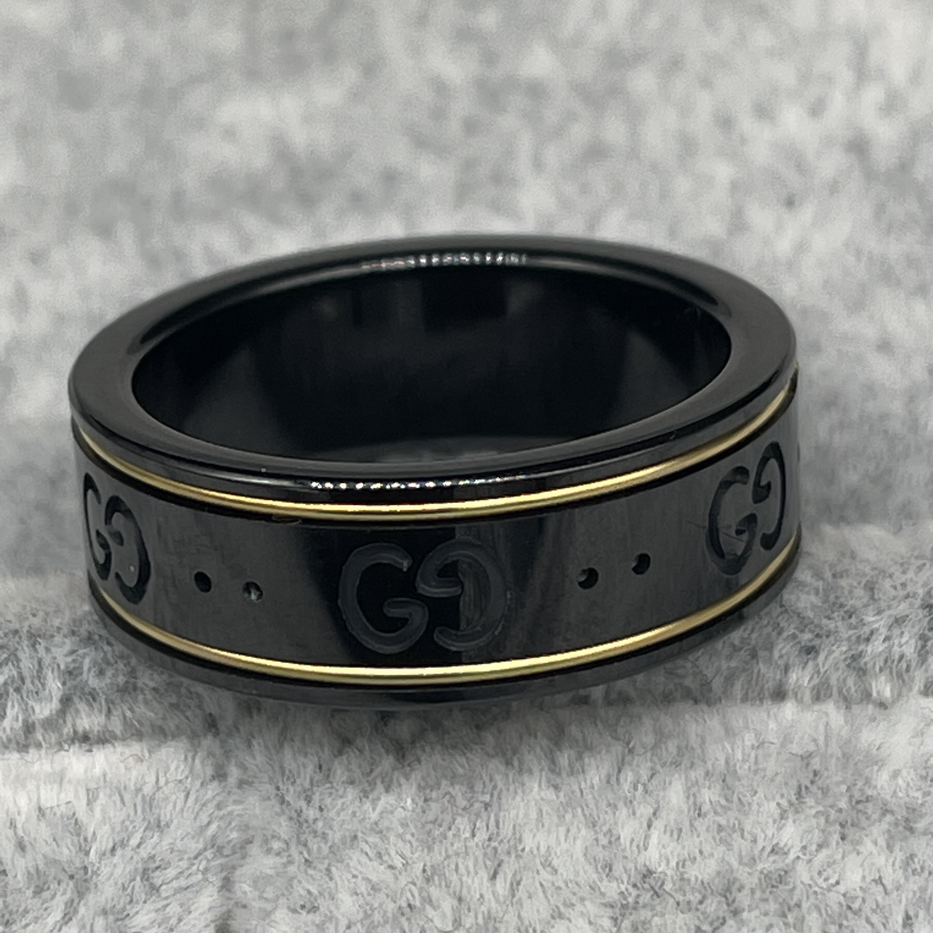 Icon thin band in Gold Ring Size #8 The emblematic GG pattern is engraved onto a black synthetic corundum ring Comes with box, pouch, and shopping bag.