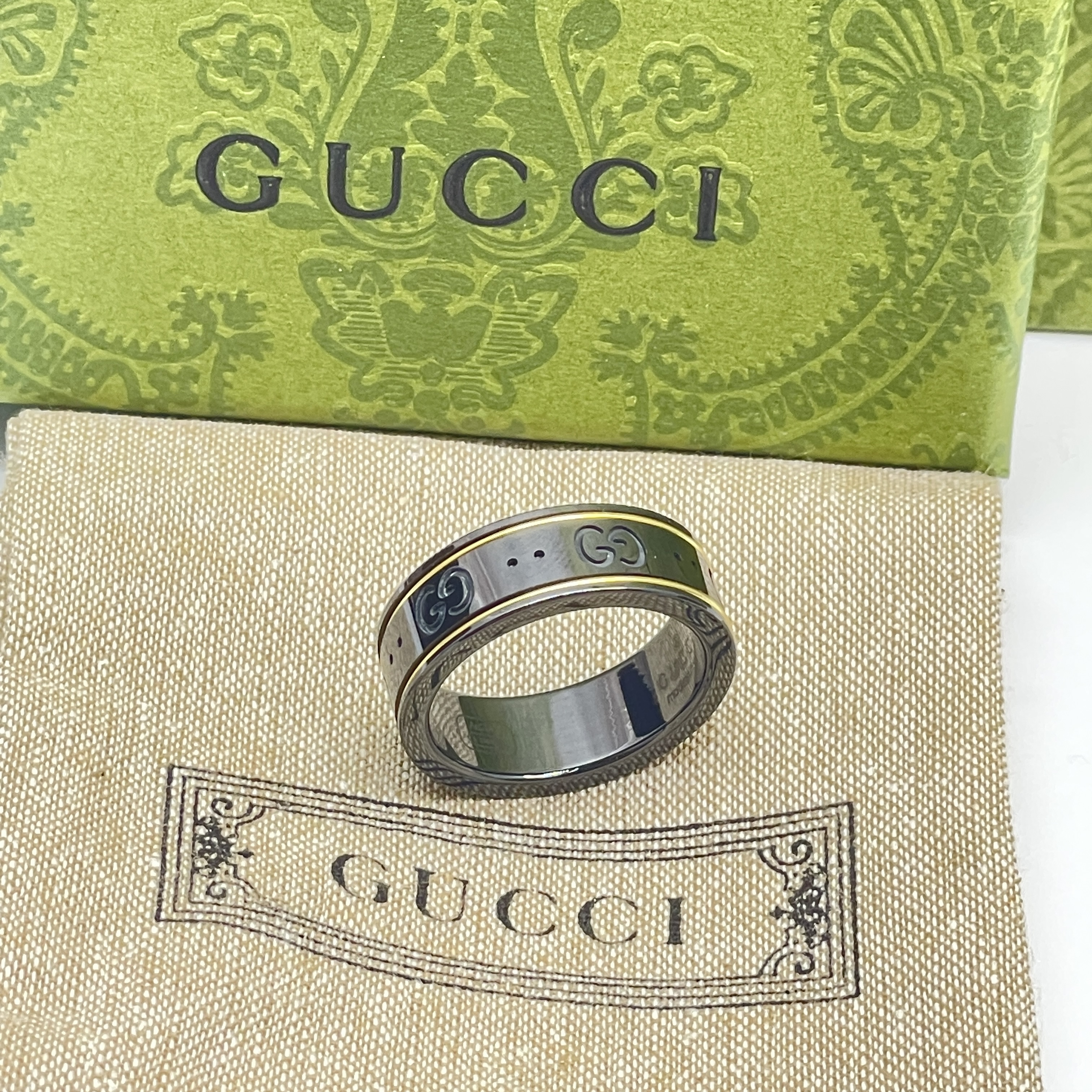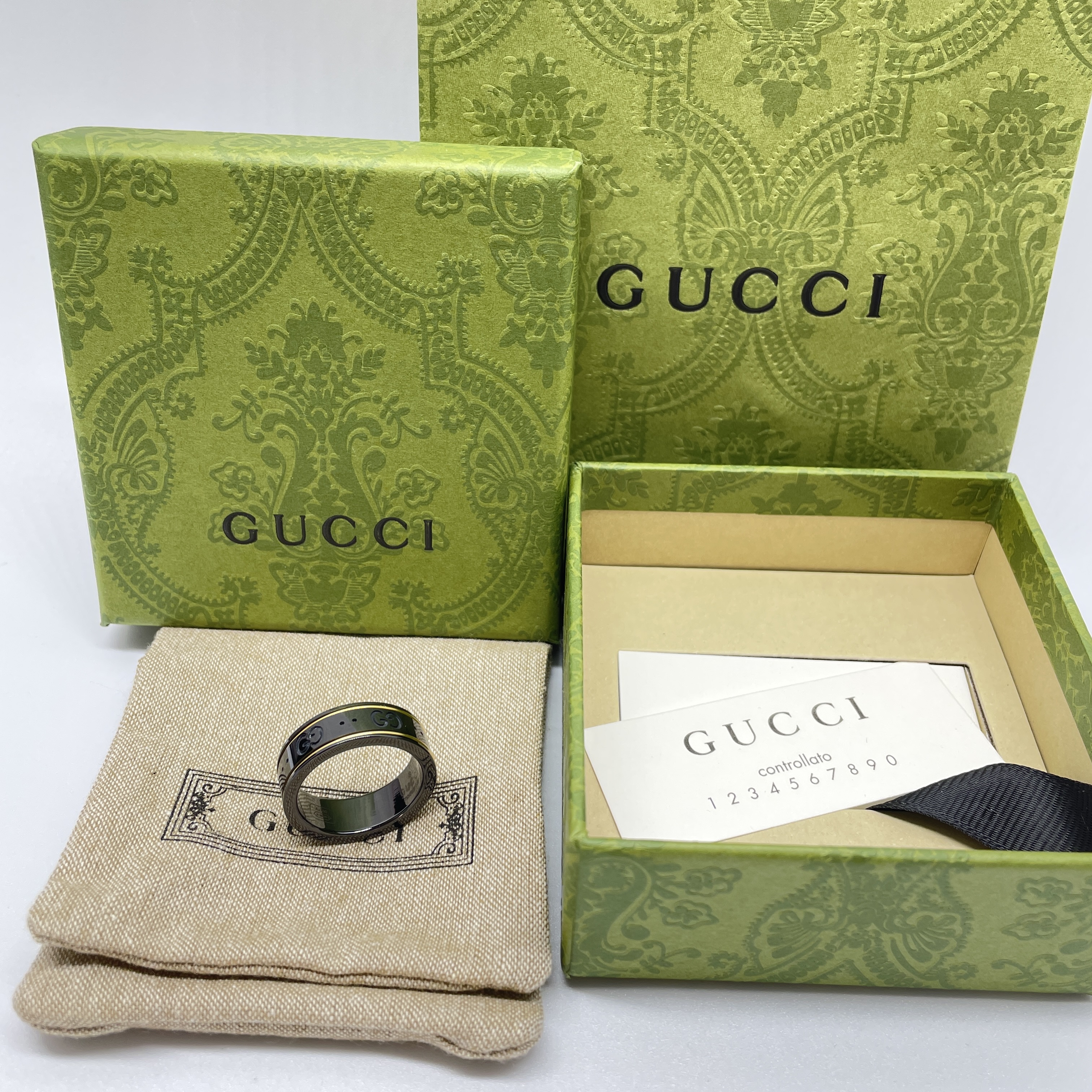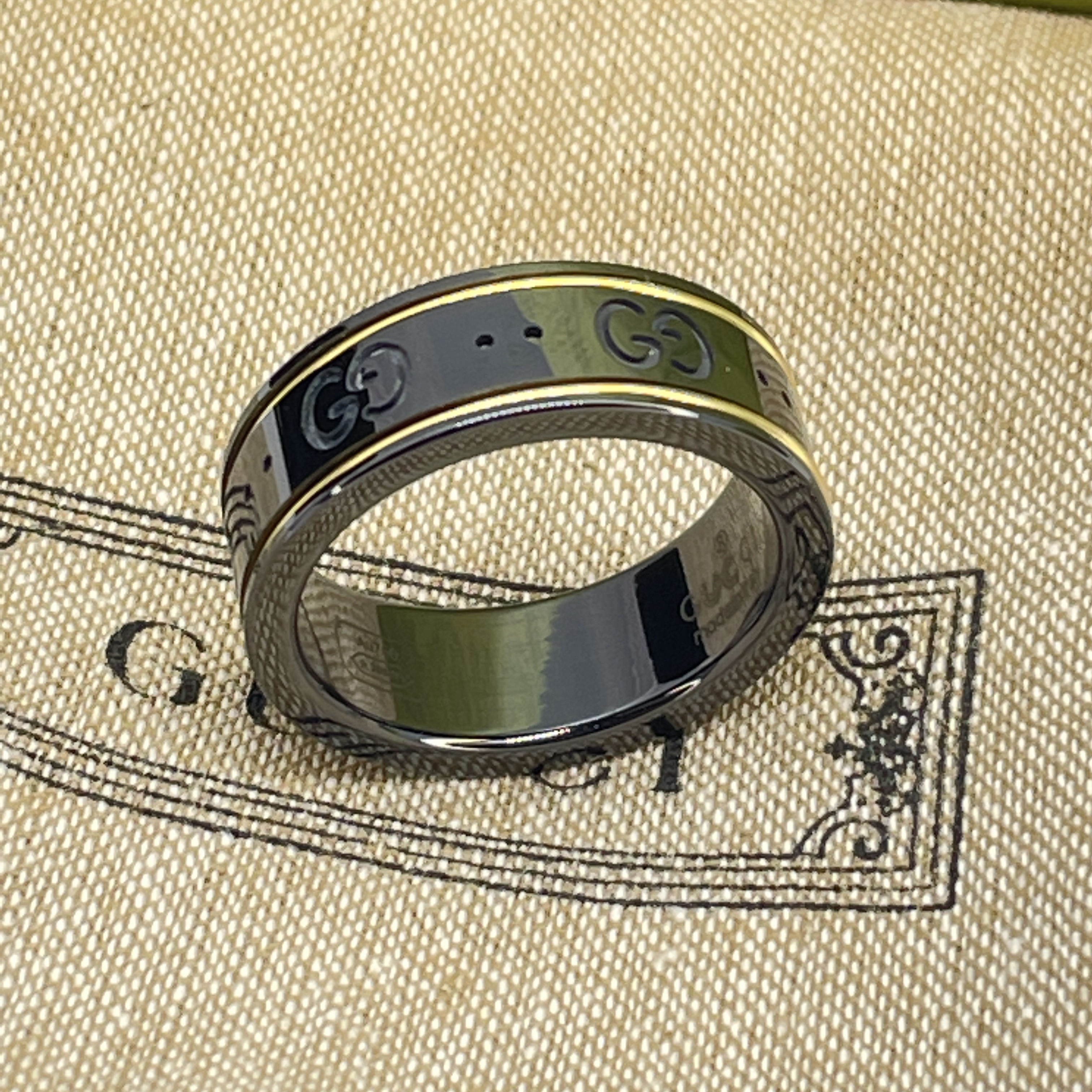 Icon thin band in Gold Ring Size #8 The emblematic GG pattern is engraved onto a black synthetic corundum ring Comes with box, pouch, and shopping bag.